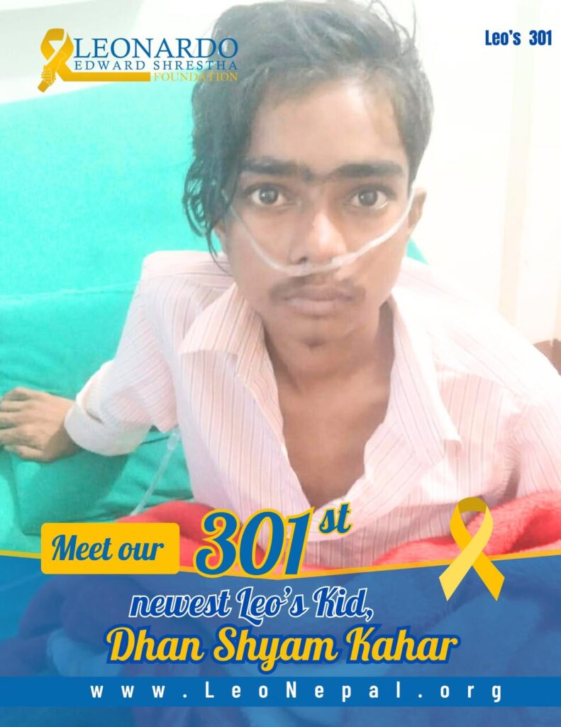 We are honored to welcome 17-year-old Dhanshyam Kahar as our 301st Leo’s Kid! This resilient young man from Rupandehi has been diagnosed with Chronic Myeloid Leukemia (CML) and is currently receiving treatment at Bharatpur Cancer Hospital.