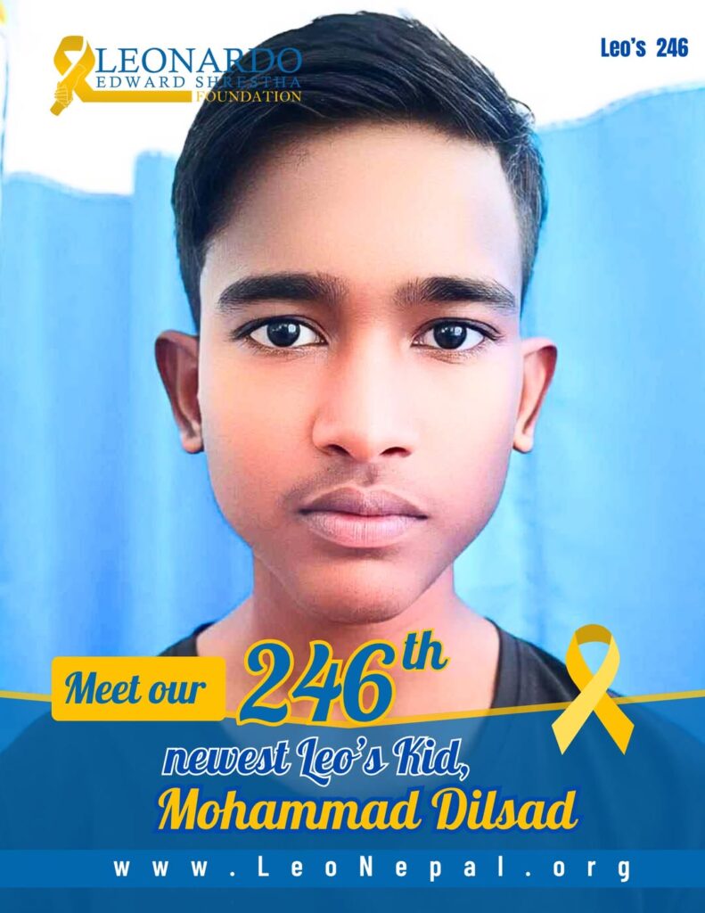 We are honored to welcome 17-year-old Mohammad Dilsad from Vijay Nagar, Kapilvastu, as our 246th Leo’s Kid! This brave young man has been diagnosed with T-ALL, a type of blood cancer, and is currently receiving treatment at Bhaktapur Cancer Hospital.