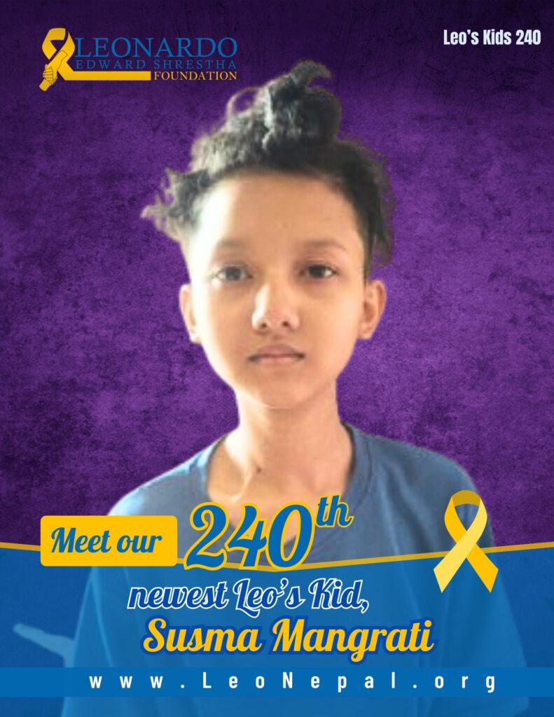 We are so happy to welcome 16-year-old Susma Mangrati from Dharan as our 240th Leo’s Kid! This brave young girl has been diagnosed with blood cancer and is currently receiving treatment at Bhaktapur Cancer Hospital.