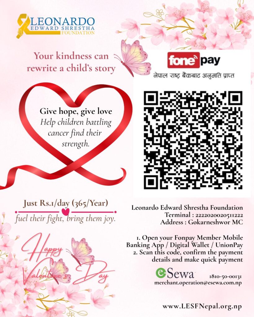 This Valentine’s Day, let your heart beat for the brave kids fighting cancer 💓💖. Your tiny contribution of just Rs.1 a day (Rs.365 a year) can be a lifeline of hope, comfort, and joy for children battling cancer. Every small donation fuels their fight, brings smiles to their faces, and helps them feel loved and supported in their toughest journey. Join the Leonardo Edward Shrestha Foundation and spread love that saves young lives—donate via eSewa or scan the QR code and make this Valentine’s a celebration of hope for cancer‑warrior kids! 🌸🎉
